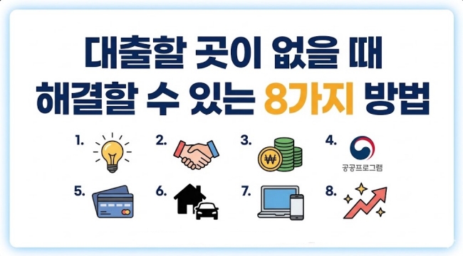 모든 은행에서 거절당했을 때는 방향을 바꿔야 합니다. 당신의 현재 위기 상황에 맞춰 즉시 행동할 수 있는 8가지 카테고리별 핵심 돌파구를 표로 한눈에 정리했습니다.